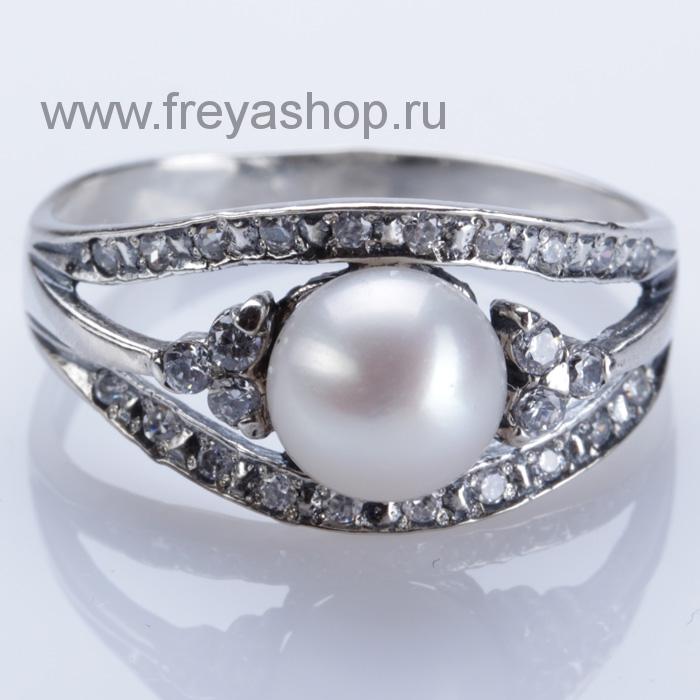 Нежное изящное серебряное кольцо. Матовый блеск крупной жемчужины оттеняется мерцанием целой россыпи фианитов и страз. Жемчужину "поддерживают" с двух сторон серебряные вставки с тремя достаточно крупными фианитами. Вся фианитово-жемчужная композиция сверху и снизу обрамлена множеством страз, великолепно переливающихся как при естественном, так и при искусственном освещении. Такое кольцо вполне могла получить на помолвку какая-нибудь европейская принцесса в Средневековье. Российские ювелиры.